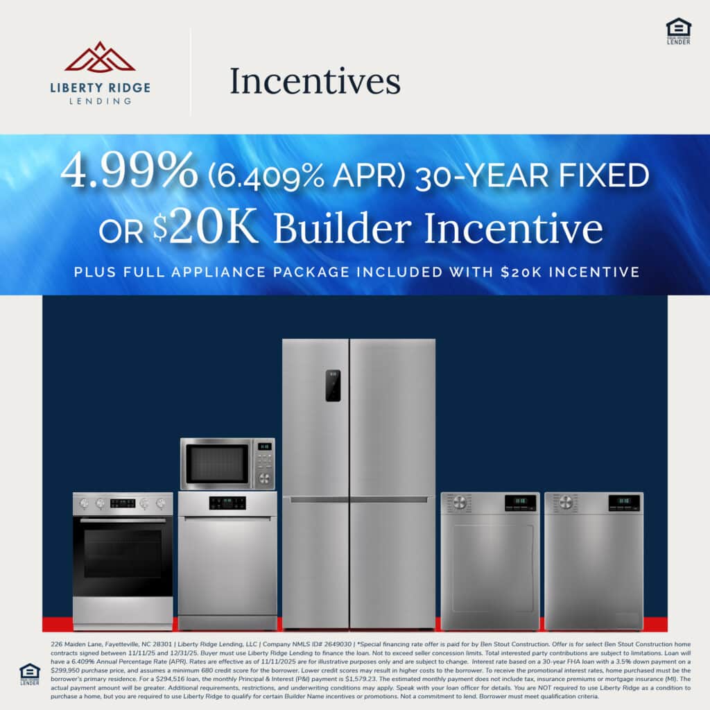 226 Maiden Lane, Fayetteville, NC 28301 | Liberty Ridge Lending, LLC | Company NMLS ID# 2649030 | *Special financing rate offer is paid for by Ben Stout Construction. Offer is for select Ben Stout Construction home contracts signed between 11/11/25 and 12/31/25. Buyer must use Liberty Ridge Lending to finance the loan. Not to exceed seller concession limits. Total interested party contributions are subject to limitations. Loan will have a 6.409% Annual Percentage Rate (APR). Rates are effective as of 11/11/2025 are for illustrative purposes only and are subject to change. Interest rate based on a 30-year FHA loan with a 3.5% down payment on a $299,950 purchase price, and assumes a minimum 680 credit score for the borrower. Lower credit scores may result in higher costs to the borrower. To receive the promotional interest rates, home purchased must be the borrower’s primary residence. For a $294,516 loan, the monthly Principal & Interest (P&I) payment is $1,579.23. The estimated monthly payment does not include tax, insurance premiums or mortgage insurance (MI). The actual payment amount will be greater. Additional requirements, restrictions, and underwriting conditions may apply. Speak with your loan officer for details. You are NOT required to use Liberty Ridge as a condition to purchase a home, but you are required to use Liberty Ridge to qualify for certain Builder Name incentives or promotions. Not a commitment to lend. Borrower must meet qualification criteria. Images are for illustrative purposes only and may not represent the actual appliances included.