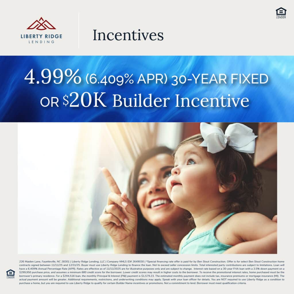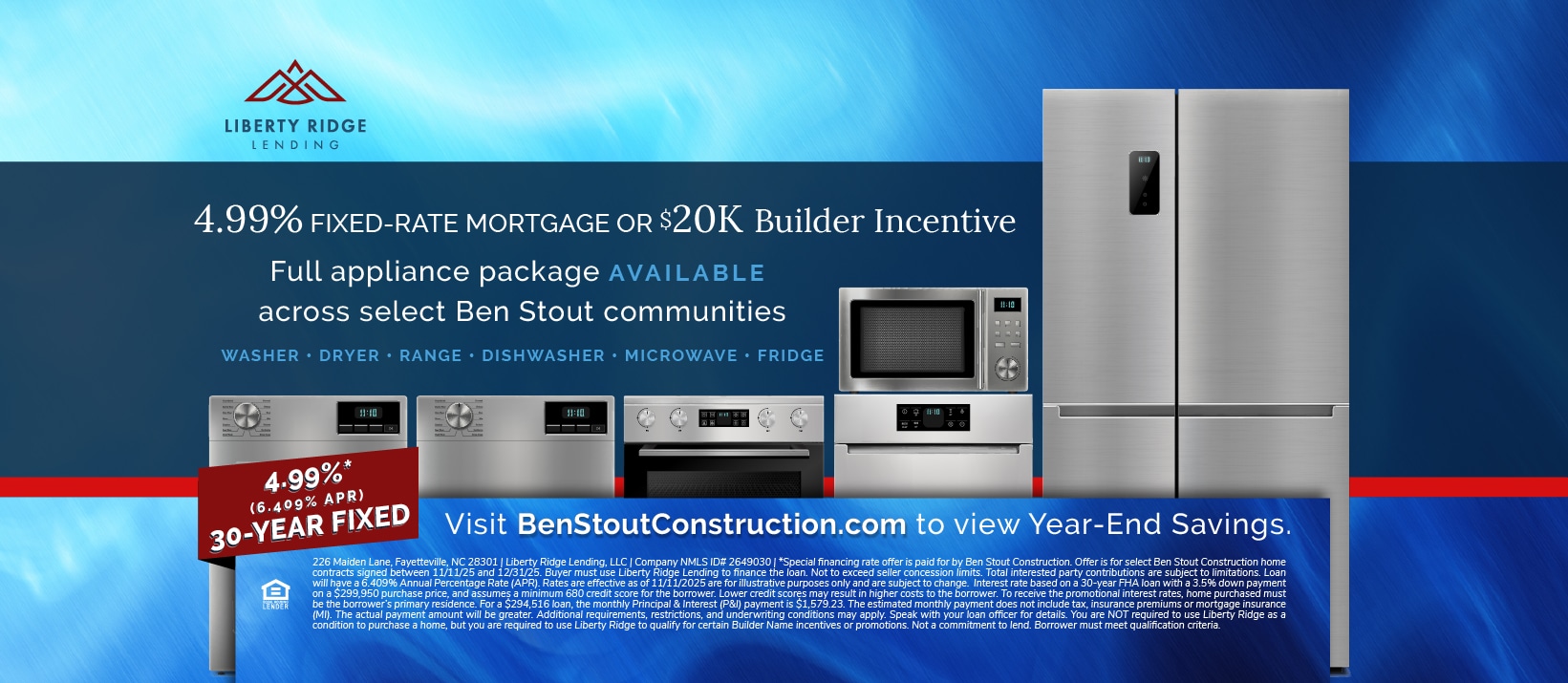 226 Maiden Lane, Fayetteville, NC 28301 | Liberty Ridge Lending, LLC | Company NMLS ID# 2649030 | *Special financing rate offer is paid for by Ben Stout Construction. Offer is for select Ben Stout Construction home contracts signed between 11/11/25 and 12/31/25. Buyer must use Liberty Ridge Lending to finance the loan. Not to exceed seller concession limits. Total interested party contributions are subject to limitations. Loan will have a 6.409% Annual Percentage Rate (APR). Rates are effective as of 11/11/2025 are for illustrative purposes only and are subject to change. Interest rate based on a 30-year FHA loan with a 3.5% down payment on a $299,950 purchase price, and assumes a minimum 680 credit score for the borrower. Lower credit scores may result in higher costs to the borrower. To receive the promotional interest rates, home purchased must be the borrower’s primary residence. For a $294,516 loan, the monthly Principal & Interest (P&I) payment is $1,579.23. The estimated monthly payment does not include tax, insurance premiums or mortgage insurance (MI). The actual payment amount will be greater. Additional requirements, restrictions, and underwriting conditions may apply. Speak with your loan officer for details. You are NOT required to use Liberty Ridge as a condition to purchase a home, but you are required to use Liberty Ridge to qualify for certain Builder Name incentives or promotions. Not a commitment to lend. Borrower must meet qualification criteria.