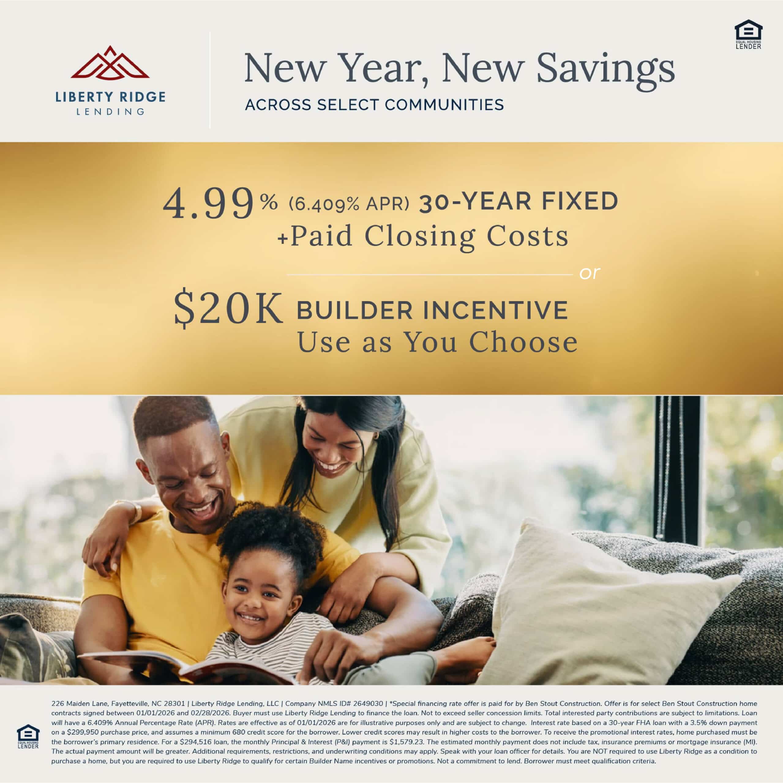 226 Maiden Lane, Fayetteville, NC 28301 Liberty Ridge Lending, LLC Company NMLS ID# 2649030 *Special financing rate offer is paid for by Ben Stout Construction. Offer is for select Ben Stout Construction home contracts signed between 01/01/2026 and 02/28/2026. Buyer must use Liberty Ridge Lending to finance the loan. Not to exceed seller concession limits. Total interested party contributions are subject to limitations. Loan will have a 6.409% Annual Percentage Rate (APR). Rates are effective as of 101/01/2026 are for illustrative purposes only and are subject to change. Interest rate based on a 30-year FHA loan with a 3.5% down payment on a $299,950 purchase price, and assumes a minimum 680 credit score for the borrower. Lower credit scores may result in higher costs to the borrower. To receive the promotional interest rates, home purchased must be the borrower’s primary residence. For a $294,516 loan, the monthly Principal & Interest (P&I) payment is $1,579.23. The estimated monthly payment does not include tax, insurance premiums or mortgage insurance (MI). The actual payment amount will be greater. Additional requirements, restrictions, and underwriting conditions may apply. Speak with your loan officer for details. You are NOT required to use Liberty Ridge as a condition to purchase a home, but you are required to use Liberty Ridge to qualify for certain Builder Name incentives or promotions. Not a commitment to lend. Borrower must meet qualification criteria. Images are for illustrative purposes only and may not represent the actual appliances included.